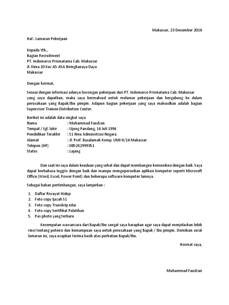 Top Contoh Surat Lamaran Kerja Indomaret 90 Bagi Inspirasi Format Surat Lamaran Oleh Post Contoh Surat Lamaran Kerja Indomaret Gawe Cv from gawecv.com Contoh surat lamaran kerja indomaret adalah merupakan postingan yang akan saya bahas pada kesempatan yang berbahagia ini untuk kamu para pengunjung setia semuanya, khususnya bagi kamu yang ingin melamar pekerjaan di indomaret. Surat lamaran kerja merupakan salah satu surat resmi yang dijadikan sebagai surat pengantar berbagai lampiran dokumen yang terkait. Sebagai tambahan anda dapat menyertakan berkas lainnya yang dapat. Padahal, ada banyak hal yang harus kamu perhatikan. 15 contoh surat lamaran pekerjaan di indomaret. Sahabat 99, apakah kamu sedang bersiap untuk masuk ke dunia kerja? Ada juga contoh surat lamaran kerja simple siap download. Yang dimaksud dengan surat lamaran kerja indomaret adalah surat lamaran yang dibuat dan diajukan oleh seseorang dengan maksud untuk melamar pekerjaan di indomaret.