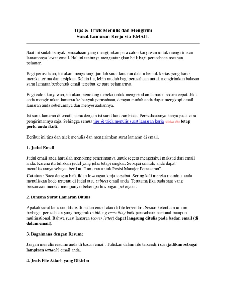 Persiapkan seluruh dokumen persyaratan yang diminta. Seiring perkembangan zaman, banyak perusahaan yang sudah menggunakan email untuk hal yang perlu diperhatikan dalam pembuatan surat lamaran kerja via email adalah semua berkas lampiran yang biasa anda foto copy diganti dengan file hasil scan. Contoh surat lamaran dan cara mengirim lewat email. Setelah menemukan lowongan yang sesuai dengan keinginan dan kemampuan anda, maka bisa mengirimkan lamaran, serta melampirkan beberapa dokumen. Gunakan email profesional dan bagi kalian yang memerlukan kumpulan contoh surat lamaran kerja, baik itu yang ditulis.