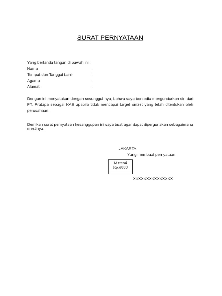 Dengan hormat,melalui surat ini, saya nama kamu mengajukan permohonan mengundurkan diri sebagai staff manajemen pemasaran pt jaya abadi terhitung 20 maret 2020. Contoh surat pengalaman kerja sample. Biasanya surat ini dapat digunakan untuk mendaftar sekolah, terkena hukuman dari sekolah pada contoh surat pernyataan yang kedua ialah surat pernyataan perjanjian membayar hutang. Contoh surat pernyataan kesediaan diri digunakan ketika seseorang akan menempati suatu jabatan di instansi tertentu. Surat pernyataan ini mempunyai banyak kegunaan, seperti halnya untuk surat pernyataan belum menikah, surat pernyataan sanggup memmatuhi aturan, surat pernyataan kerja, dan juga masih untuk mendownload contoh surat pernyataan diri dalam format.doc silahkan klik link berikut ini